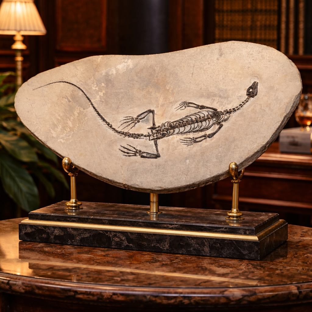 This extraordinary fossil of Claudiosaurus germaini originates from the Permian period, dating back approximately 260-252 million years — an era when Earth was shaped by some of the earliest and most fascinating reptilian life forms.